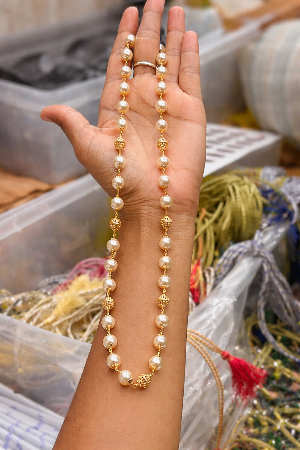Celebrate timeless beauty with this Handmade Pearl Chain, thoughtfully crafted to reflect elegance in every detail. Designed with luminous pearls linked by delicate gold-toned connectors and highlighted with intricate gold beads, this 21-inch chain is a perfect blend of tradition and simplicity.